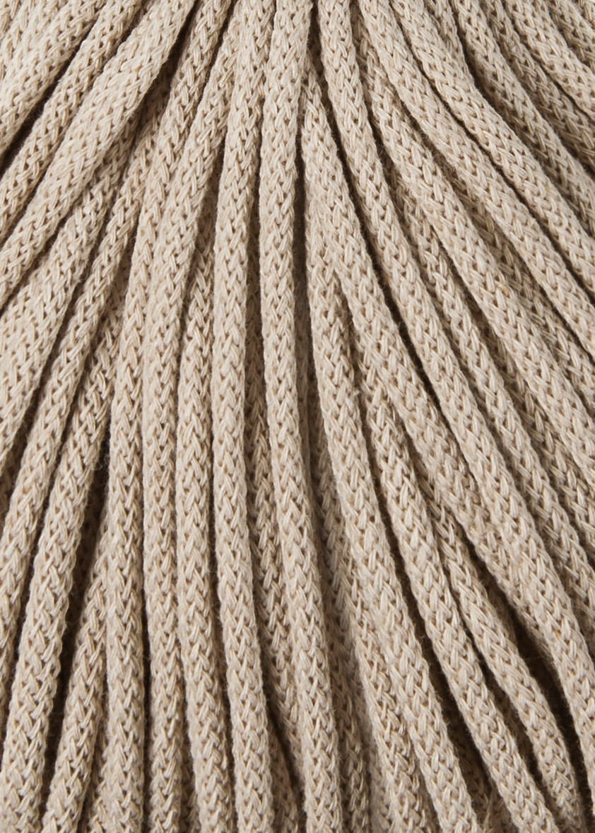 Bobbiny Premium 5 mm – Warm Beige is een sterk en stijlvol katoenkoord gemaakt van 100% gerecycled katoen. De 72-strengs getwijnde structuur maakt dit garen extra stevig en slijtvast, waardoor het ideaal is voor haken, breien, macramé en het maken van woonaccessoires zoals manden, kussens, tassen, vloerkleden en wanddecoratie.
