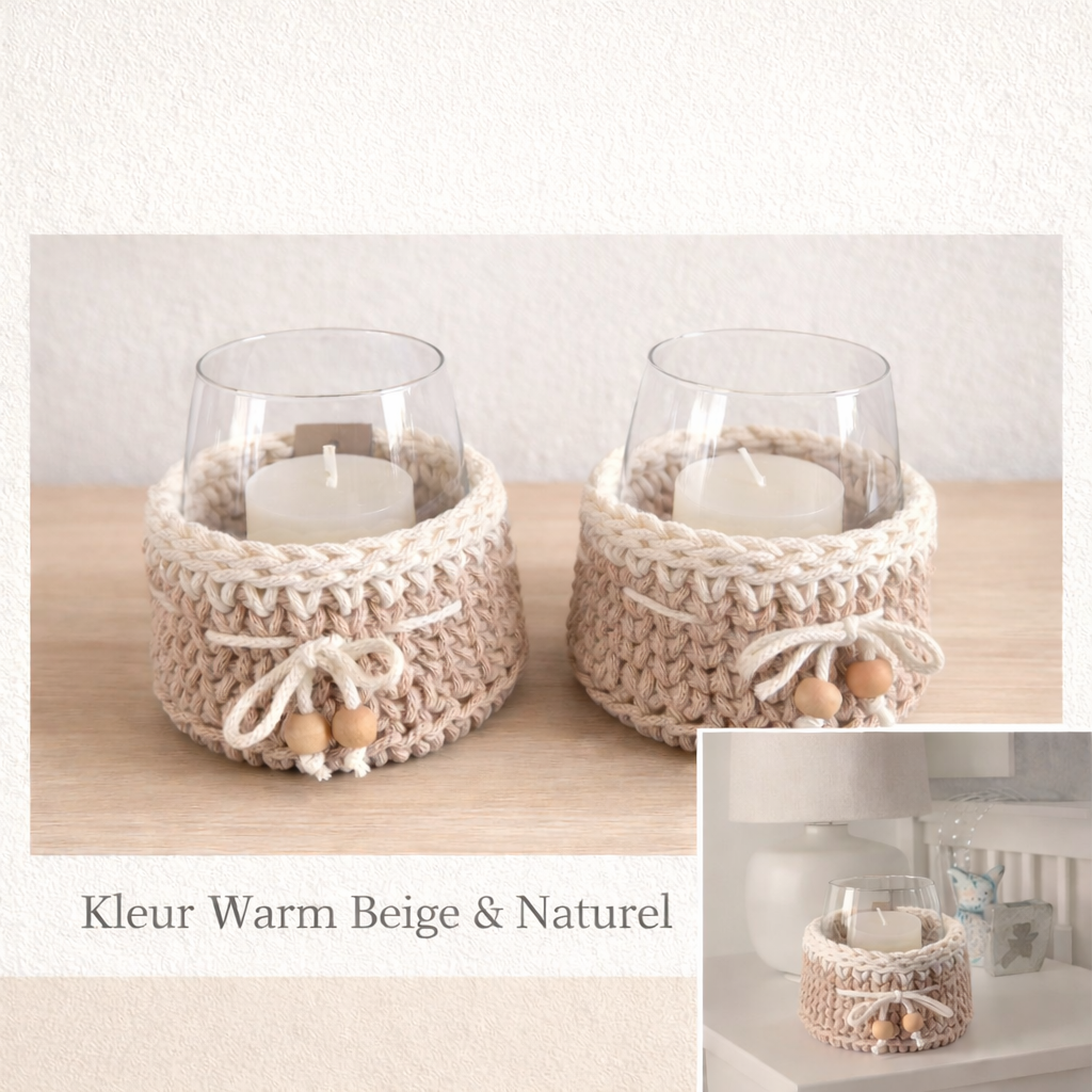 Inclusief glaasje en kaars, afgewerkt in de zachte kleuren Warm Beige en Naturel – perfect voor een warme, gezellige uitstraling.